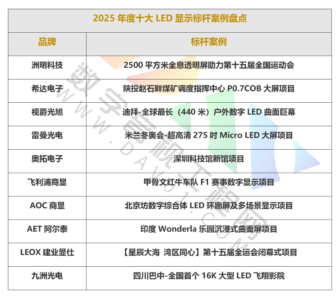 从国际赛事舞台到国家广电总局公示的视听系统典型案例,从户外超大屏、XR虚拟拍摄到创意显示与沉浸式体验...……在过去的2025年,中国LED显示企业以前沿科技与场景化解决方案,在全球范围内打造了一系列标志性工程。本期DAV盘点,聚焦于洲明科技、希达电子、视爵光旭、雷曼光电、奥拓电子、飞利浦商显、AOC商显、AET阿尔泰、LEOX建业显仕、九洲光电等行业代表厂商的卓越实践,全面印证中国LED产业通过对技术生态与深度场景的掌控,成为赋能全球千行万业、智显未来的核心力量。