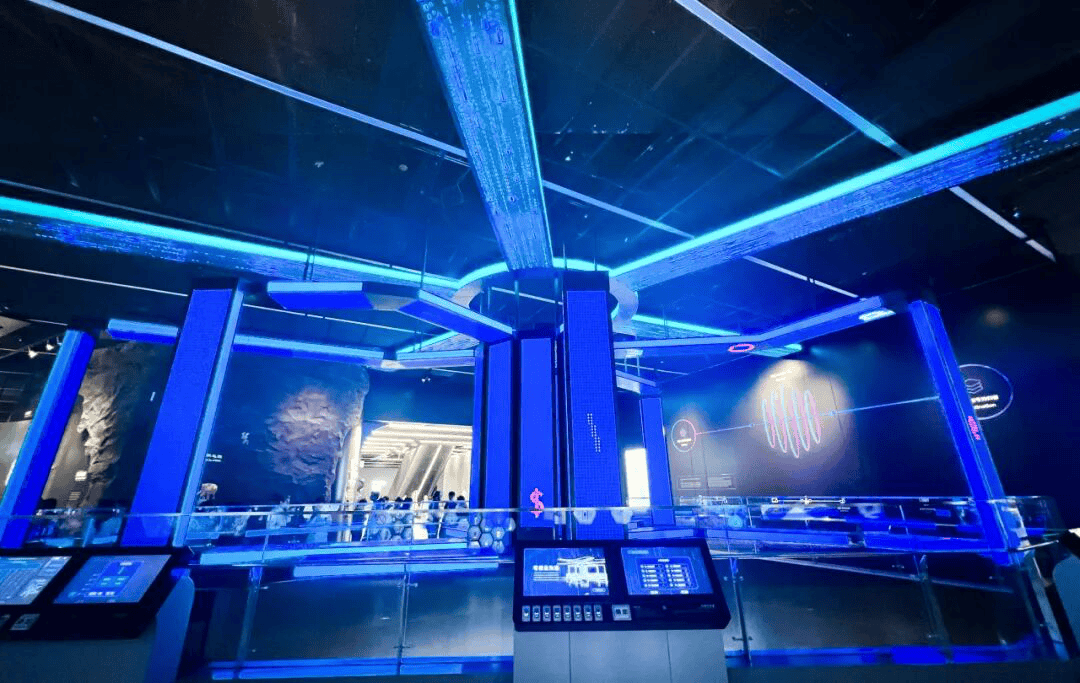 项目在多个核心展区实现关键突破:在首层,打造了国内科技馆中极少数达到DCI工业标准的LED影院,并构建了整合34㎡立屏与30㎡地砖屏的XR造梦空间,通过AI视觉追踪与机械臂实现“步入即拍、即时合成”的沉浸式互动闭环。在二楼序厅,采用柔性、球形等异形屏,结合AI语义与动作识别,首次在大型展馆中实现了观众通过自然语音和手势与屏幕信息深度交互。最具挑战的是三楼通信科技专馆,由2000余块箱体构成、最高离地15米的“八爪鱼”异形巨幕,将显示技术升华为震撼的科幻艺术装置。